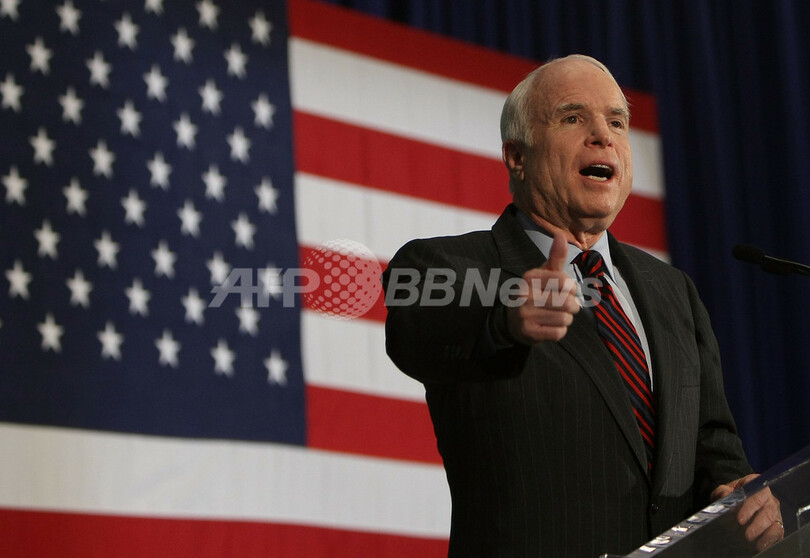 マケイン氏:NAFTAには賛成の立場で、自由貿易を米外交政策(特に中東地域)における重要な要素だと考えている。オバマ氏とは異なり、コロンビアとの貿易協定締結に前向き。(c)AFP