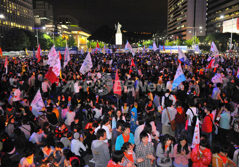 ソウル(Seoul)では5日夜も市民2万人以上が集まり、米国産牛肉の輸入再開に抗議するキャンドル集会を行った。(c)AFP