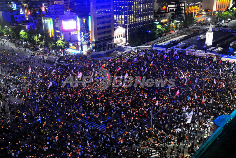 ソウル(Seoul)では5日夜も市民2万人以上が集まり、米国産牛肉の輸入再開に抗議するキャンドル集会を行った。(c)AFP