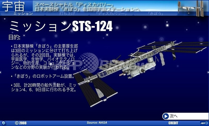 【6月6日 AFP】日本初の実験棟「きぼう(Kibo)」を設置するため、国際宇宙ステーション(International Space Station、ISS)へ向かったスペースシャトル「ディスカバリー(Discovery)」について示したアニメーション。(c)AFP