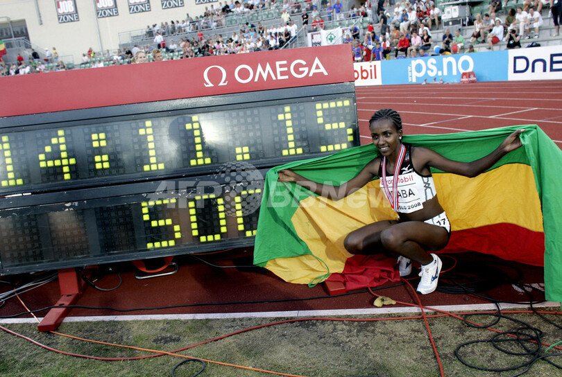 世界陸上選手権(IAAF World Championships in Athletics)の女子10000メートルで2005、2007年と大会2連覇中の22歳のディババは、ゴールデン・リーグ2008(IAAF Golden League 2008)第2戦、ビスレット・ゲーム(Bislett Games)で、同じエチオピアのメセレット・デファー(Meseret Defar)が2007年の同大会(エクソンモービル・ビスレット・ゲーム、Exxon Mobil Bislett Games)で記録していた14分16秒63を更新した。(c)AFP
