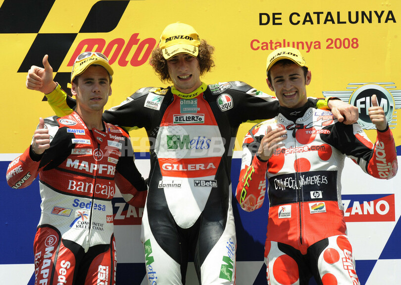 【6月8日 AFP】世界ロードレース選手権(WGP 2008)第7戦・カタルーニャGP・250ccクラス、決勝。2番グリッドからスタートしたメティス・ジレラ(Metis Gilera)のマルコ・シモンセッリ(Marco Simoncelli)は、41分01秒859のタイムをマークして優勝を果たした。