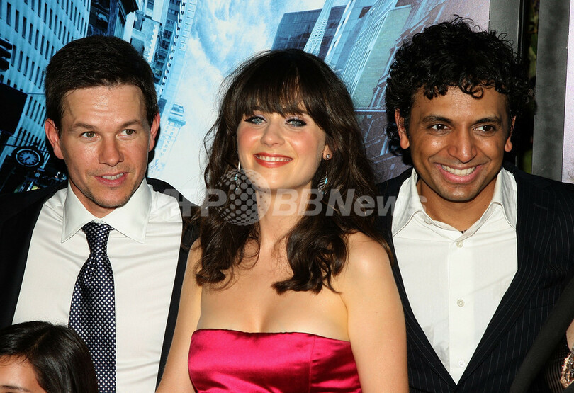 ニューヨーク(New York)のジーグフェルド・シアター(Ziegfeld Theater)で開催された映画『ハプニング(The Happening)』のプレミア上映会に登場した(左から)出演俳優のマーク・ウォルバーグ(Mark Wahlberg)、出演女優のズーイー・デシャネル(Zooey Deschanel)、監督のM・ナイト・シャマラン(M. Night Shyamalan、2008年6月10日撮影)。(c)AFP/Getty Images/Stephen Lovekin