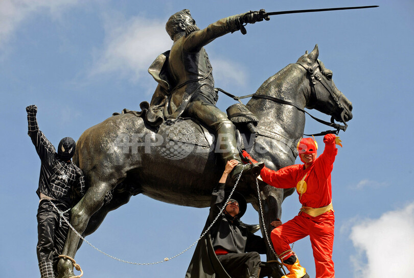 ニュース ライフ こぼれ話 スパイダーマンや怪傑ゾロが子どもの共同親権を要求? 2008年6月16日 12:17 発信地:ボゴタ/コロンビア [ 中南米 コロンビア ] このニュースをシェア ‹ › ❮ 3/3 ❯ コロンビアのボゴタ(Bogota)で、正義のヒーローであるスパイダーマン(左)、怪傑ゾロ(中央)、フラッシュの仮装をして南米独立運動指導者のシモン・ボリバル(Simon Bolivar)の彫像の台に上り、 子どもの共同親権を要求する離婚をした父親3人(2008年6月13日撮影)。(c)AFP/Rodrigo Arangua 画像作成中 ! 【6月16日 AFP】コロンビアのボゴタ(Bogota)で13日、離婚をした父親3人が正義のヒーローであるスパイダーマン、怪傑ゾロ、フラッシュのふん装で南米独立運動指導者のシモン・ボリバル(Simon Bolivar)の彫像の台に上り、 子どもの共同親権を要求するという珍事が起きた。(c)AFP ライフ 一覧へ> メディア・報道関係・法人の方向け 写真・動画 購入のお問合せ>