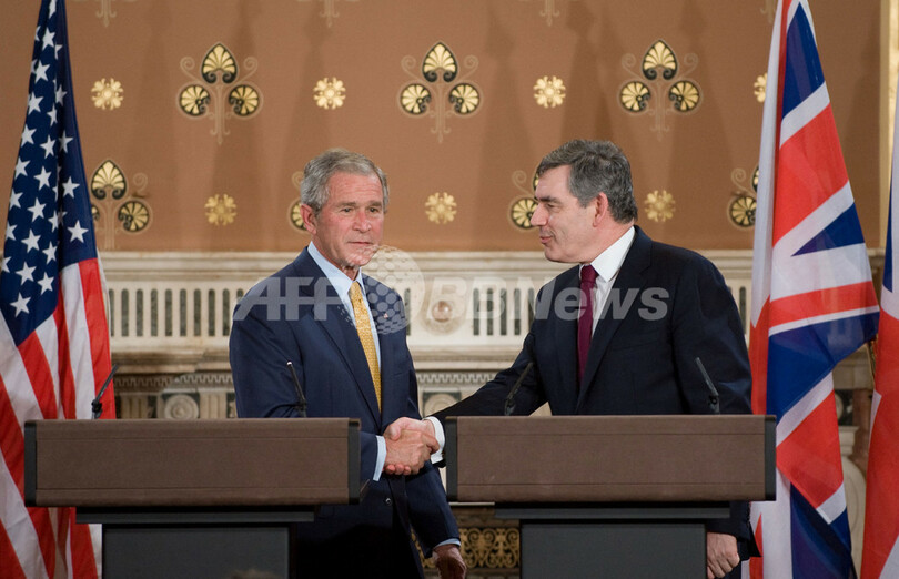 【6月16日 AFP】ゴードン・ブラウン(Gordon Brown)英首相は16日、訪英中のジョージ・W・ブッシュ(George W. Bush)米大統領と会談した。会談後の記者会見でブラウン首相は、アフガニスタンへの増派と、イランに対する制裁強化を表明し、ブッシュ大統領に配慮を示した。