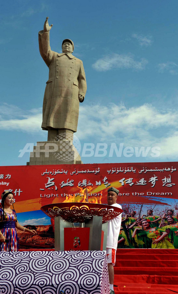 中国・新疆ウイグル自治区(Xinjiang Uighur Autonomous Region)カシュガル(Kashgar)で、北京五輪の聖火トーチに火を灯すウイグル人の走者(2008年6月18日撮影)。(c)AFP