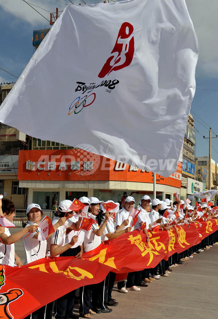 中国・新疆ウイグル自治区(Xinjiang Uighur Autonomous Region)カシュガル(Kashgar)で、北京五輪の聖火リレーを迎える住民たち(2008年6月18日撮影)。(c)AFP