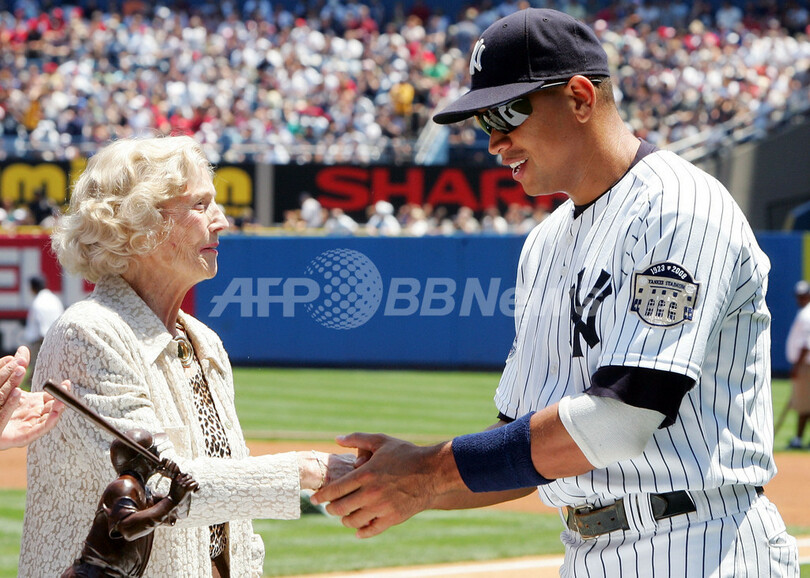 【6月22日 AFP】08MLB、ニューヨーク・ヤンキース(New York Yankees)のアレックス・ロドリゲス(Alex Rodriguez)は21日、シンシナティ・レッズ(Cincinnati Reds)との試合前に各シーズンの本塁打王に贈られるベーブ・ルース本塁打賞(Babe Ruth Home Run Award)をベーブルース氏の娘であるジュリア・ルース・スティーブンズ(Julia Ruth Stevens)さんから授与された。(c)AFP/Getty Images