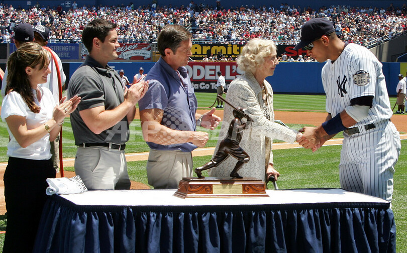 【6月22日 AFP】08MLB、ニューヨーク・ヤンキース(New York Yankees)のアレックス・ロドリゲス(Alex Rodriguez)は21日、シンシナティ・レッズ(Cincinnati Reds)との試合前に各シーズンの本塁打王に贈られるベーブ・ルース本塁打賞(Babe Ruth Home Run Award)をベーブルース氏の娘であるジュリア・ルース・スティーブンズ(Julia Ruth Stevens)さんから授与された。(c)AFP/Getty Images