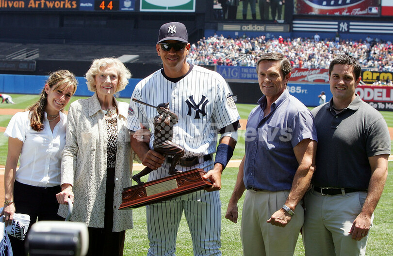 【6月22日 AFP】08MLB、ニューヨーク・ヤンキース(New York Yankees)のアレックス・ロドリゲス(Alex Rodriguez)は21日、シンシナティ・レッズ(Cincinnati Reds)との試合前に各シーズンの本塁打王に贈られるベーブ・ルース本塁打賞(Babe Ruth Home Run Award)をベーブルース氏の娘であるジュリア・ルース・スティーブンズ(Julia Ruth Stevens)さんから授与された。(c)AFP/Getty Images