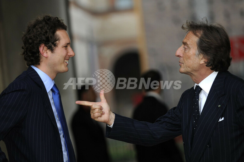 イタリア・ミラノ(Milan)で、アルファロメオ(Alfa Romeo)の新モデル「MiTo」発表にあたり記者会見で言葉を交わす、ルカ・コルデーロ・ディ・モンテゼーモロ(Luca Cordero Di Montezemolo)フィアット(Fiat)会長(右)とジョン・エルカン(John Elkann)副社長(2008年6月20日撮影)。(c)AFP/GIUSEPPE CACACE