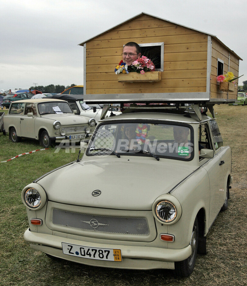 【6月23日 AFP】ドイツ東部の都市ツヴィッカウ(Zwickau)で21日、第15回国際トラバント・ドライバー・ミーティング(International Trabant drivers meeting)に登場した、車体の屋根に「家」を乗せた旧東ドイツ製乗用車トラバント(Trabant)。
