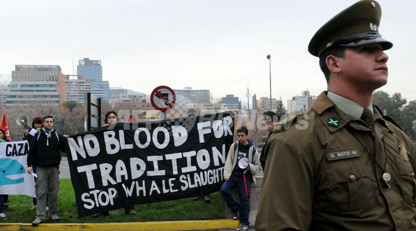 また、開幕前日には、サンティアゴ市内の公園に集まった約2000人が巨大なクジラを形作り、商業捕鯨の一時停止維持を訴えた。
