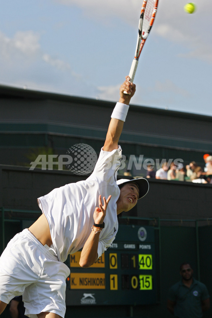 【6月24日 AFP】テニス、ウィンブルドン選手権2008(The Championships Wimbledon 2008)男子シングルス1回戦。日本の錦織圭(Kei Nishikori)は、フランスのマルク・ジケル(Marc Gicquel)と対戦。錦織はセットカウント1-1(6-4、5-7)で迎えた第3セット開始直後に腹筋の痛みを悪化させ途中棄権し、初戦敗退に終わった。