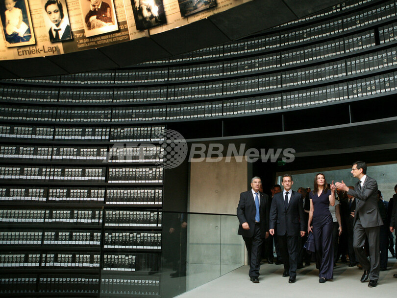 Hall of Names」に入る(左から)Avner Shalev館長、ニコラ・サルコジ(Nicolas Sarkozy)仏大統領、カーラ・ブルーニ・サルコジ(Carla Bruni-Sarkozy)夫人(2008年6月23日撮影)。(c)AFP/JIM HOLLANDER