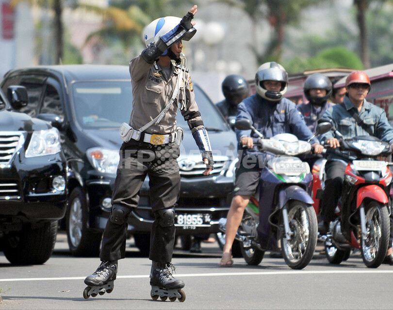 【6月24日 AFP】インドネシアの首都ジャカルタ(Jakarta)の主要道路で23日、ローラーブレードをはいて交通整理をする警察官。