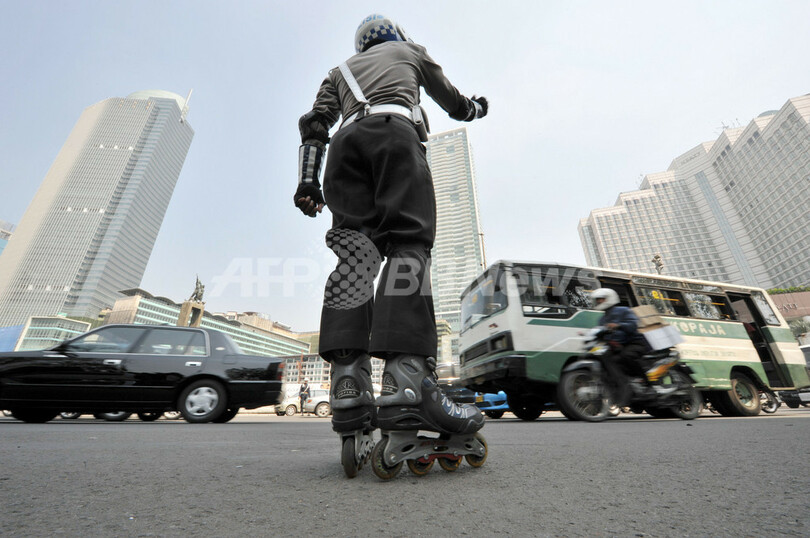 ジャカルタの警察当局は、21人の若手警官を同市の深刻な交通渋滞に対処する「ローラーブレード警官隊」に任命。ジャカルタの人口は約1200万人で、近隣アジア諸国の主要都市と同様、公共交通システムが十分に整っていない。(c)AFP