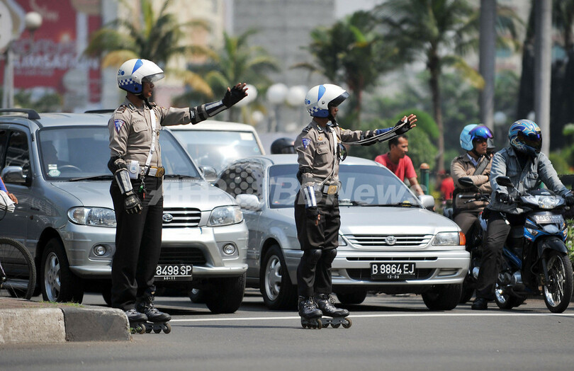 ジャカルタの警察当局は、21人の若手警官を同市の深刻な交通渋滞に対処する「ローラーブレード警官隊」に任命。ジャカルタの人口は約1200万人で、近隣アジア諸国の主要都市と同様、公共交通システムが十分に整っていない。(c)AFP