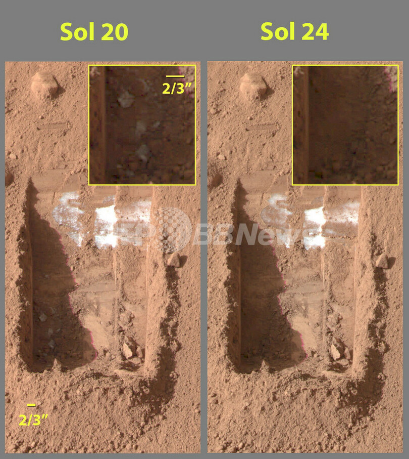 【6月24日 AFP】米航空宇宙局(NASA)は20日、火星探査機「フェニックス・マーズ・ランダー(Phoenix Mars Lander)」が火星表面を掘削した溝の中で、氷とみられる白い塊と、これが消える前後の写真を公開した。写真は15日と19日に撮影されたもの。15日の写真には、フェニックスのロボットアームが掘削した溝の左下に数個の白い塊が見えるが、19日の写真からは消えており、4日間の間に塊は気化したとみられる。(c)AFP