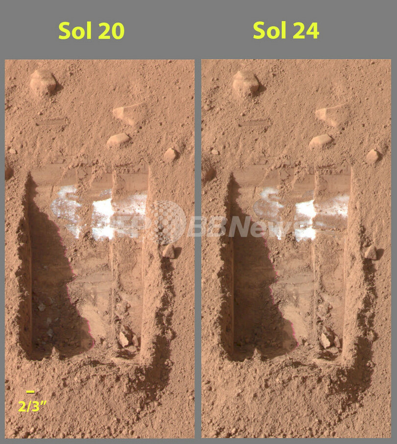 【6月24日 AFP】米航空宇宙局(NASA)は20日、火星探査機「フェニックス・マーズ・ランダー(Phoenix Mars Lander)」が火星表面を掘削した溝の中で、氷とみられる白い塊と、これが消える前後の写真を公開した。写真は15日と19日に撮影されたもの。15日の写真には、フェニックスのロボットアームが掘削した溝の左下に数個の白い塊が見えるが、19日の写真からは消えており、4日間の間に塊は気化したとみられる。(c)AFP