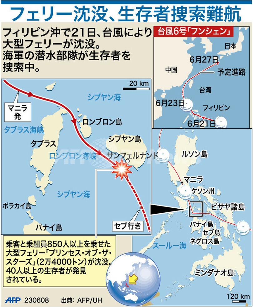 ニュース 社会 図解 【図解】大型フェリー沈没、捜索難航 2008年6月24日 14:20 発信地:マニラ/フィリピン [ アジア・オセアニア フィリピン ] このニュースをシェア (c)AFP 【6月24日 AFP】図は、フィリピン沖で21日、台風による高波を受けて沈没した大型フェリー「プリンセス・オブ・ザ・スターズ(Princess of the Stars)」の事故発生現場および台風の進攻通路を示した地図。(c)AFP<ニュース解説画像一覧へ> 社会 一覧へ> メディア・報道関係・法人の方向け 写真・動画 購入のお問合せ>