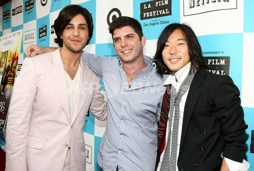 米ロサンゼルス(Los Angeles)にあるマジェスティック・クレスト・シアター(Majestic Crest Theater)で開催された映画『The Wackness』のLAプレミア上映会に登場した(左から)俳優のジョシュ・ペック(Josh Peck)、 Jonathan Levine監督、俳優のアーロン・ヨー(Aaron Yoo、2008年6月24日撮影)。(c)AFP/Getty Images/Alberto E. Rodriguez