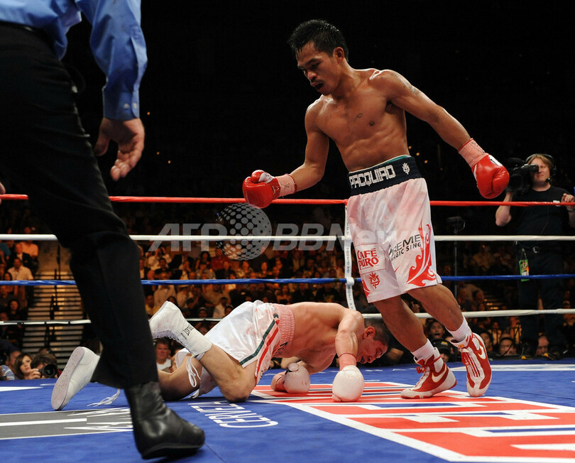 【6月29日 AFP】ボクシング、WBC世界ライト級タイトルマッチ12回戦。挑戦者のマニー・パッキャオ(Manny Pacquiao、フィリピン)は、王者のデビッド・ディアス(David Diaz、米国)と対戦。パッキャオは9ラウンド2分24秒でKO勝ちを収め、新王者に輝いた。