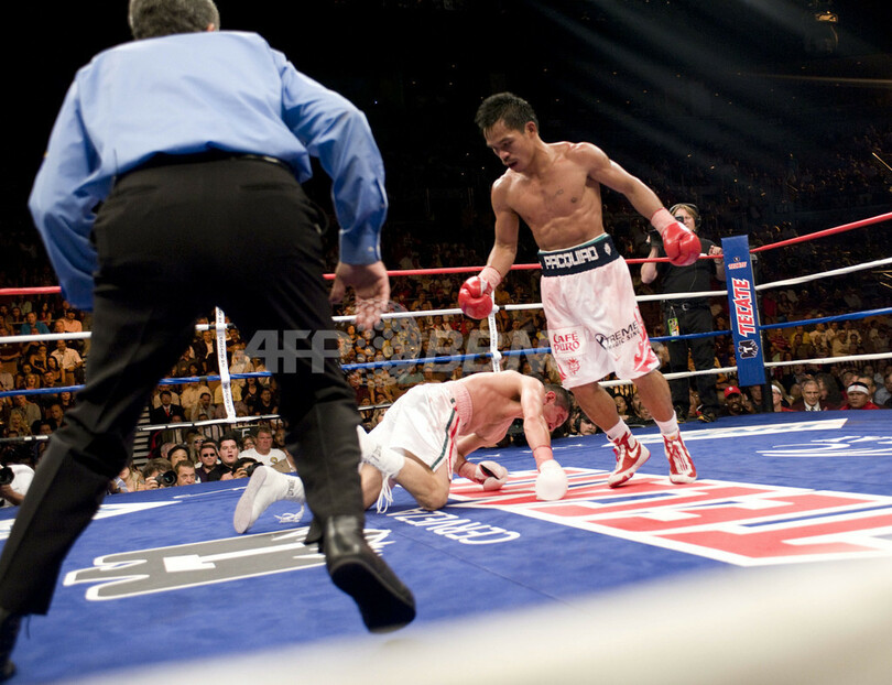 【6月29日 AFP】ボクシング、WBC世界ライト級タイトルマッチ12回戦。挑戦者のマニー・パッキャオ(Manny Pacquiao、フィリピン)は、王者のデビッド・ディアス(David Diaz、米国)と対戦。パッキャオは9ラウンド2分24秒でKO勝ちを収め、新王者に輝いた。