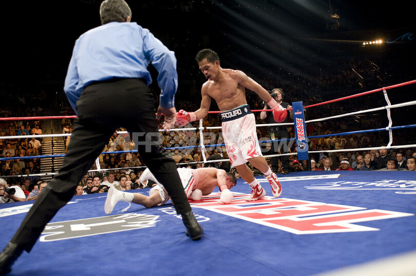【6月29日 AFP】ボクシング、WBC世界ライト級タイトルマッチ12回戦。挑戦者のマニー・パッキャオ(Manny Pacquiao、フィリピン)は、王者のデビッド・ディアス(David Diaz、米国)と対戦。パッキャオは9ラウンド2分24秒でKO勝ちを収め、新王者に輝いた。