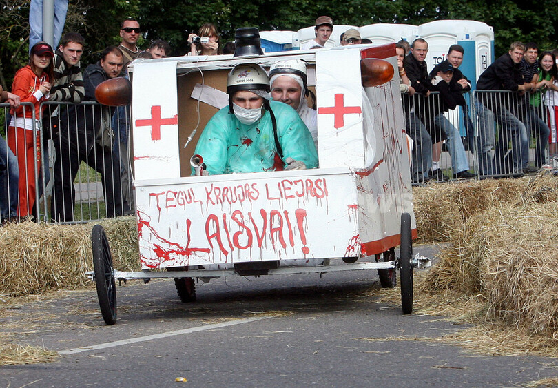 ニュース ライフ こぼれ話 大人も真剣勝負? 手作り珍車で坂道降りる「ソープ・ボックス・ダービー」 2008年6月30日 11:38 発信地:ビリニュス/リトアニア [ ヨーロッパ リトアニア ] このニュースをシェア ‹ › ❮ 2/7 ❯ リトアニアの首都ビリニュス(Vilnius)で開かれた第2回「Soapbox Derby(ソープ・ボックス・ダービー)」の参加者(2008年6月29日撮影)。(c)AFP/PETRAS MALUKAS 画像作成中 ! 【6月30日 AFP】リトアニアの首都ビリニュス(Vilnius)で29日、エンジンなしの手作りの車両で坂道を走り降りる速さを競うレース「Soapbox Derby(ソープボックス・ダービー)」が開催された。第2回大会の今回のレースには50人以上が参加し、700メートルの距離の坂道を走り降りてスピードを競い合った。(c)AFP ライフ 一覧へ> メディア・報道関係・法人の方向け 写真・動画 購入のお問合せ>