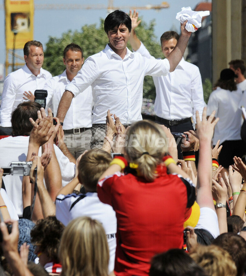 【7月1日 AFP】サッカー欧州選手権2008(Euro 2008)の決勝戦でスペインに0-1で敗れ準優勝に終わったドイツ代表が6月30日に凱旋帰国し、首都ベルリン(Berlin)に集まった大勢のファンは欧州制覇にあと一歩だった英雄たちに国旗を振って出迎えた。