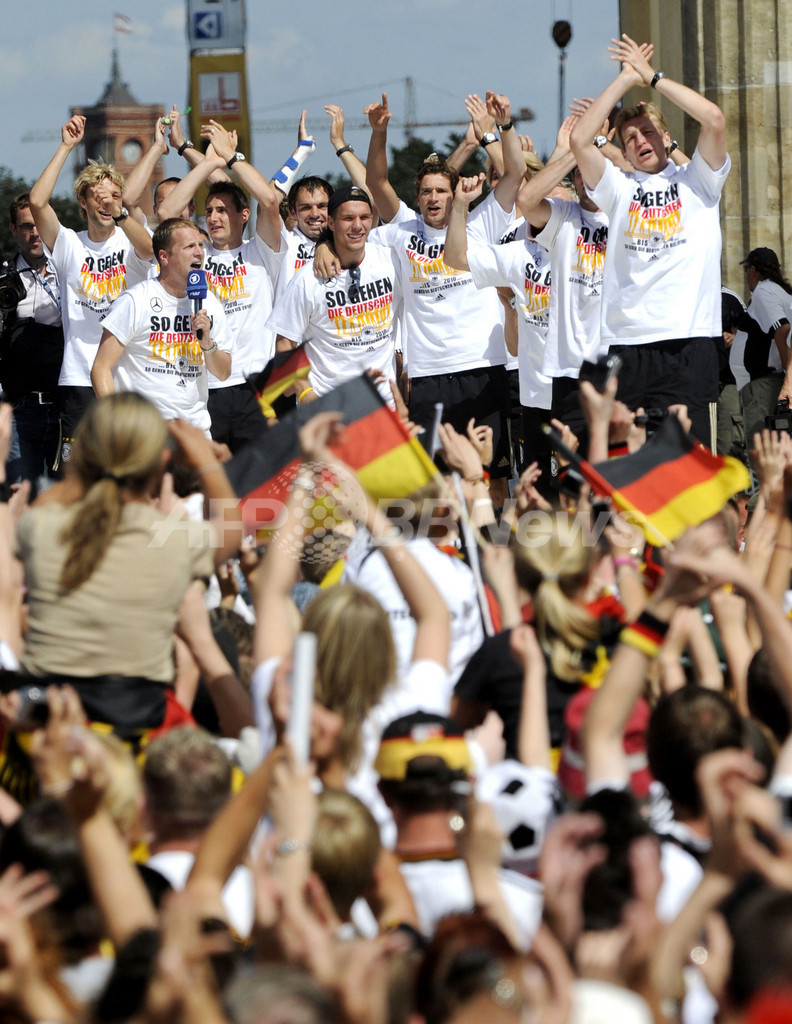 【7月1日 AFP】サッカー欧州選手権2008(Euro 2008)の決勝戦でスペインに0-1で敗れ準優勝に終わったドイツ代表が6月30日に凱旋帰国し、首都ベルリン(Berlin)に集まった大勢のファンは欧州制覇にあと一歩だった英雄たちに国旗を振って出迎えた。