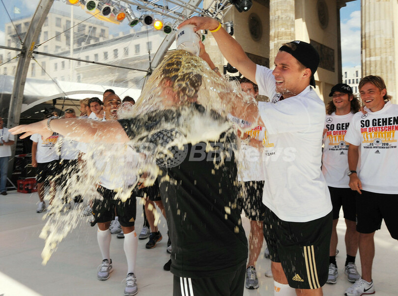 【7月1日 AFP】サッカー欧州選手権2008(Euro 2008)の決勝戦でスペインに0-1で敗れ準優勝に終わったドイツ代表が6月30日に凱旋帰国し、首都ベルリン(Berlin)に集まった大勢のファンは欧州制覇にあと一歩だった英雄たちに国旗を振って出迎えた。