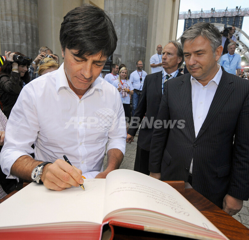 【7月1日 AFP】サッカー欧州選手権2008(Euro 2008)の決勝戦でスペインに0-1で敗れ準優勝に終わったドイツ代表が6月30日に凱旋帰国し、首都ベルリン(Berlin)に集まった大勢のファンは欧州制覇にあと一歩だった英雄たちに国旗を振って出迎えた。