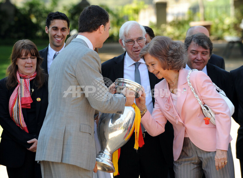 また、同代表は歓迎会の前にサルスエラ宮(Zarzuela Palace)を訪問し、国王フアン・カルロス1世(Juan Carlos)がパレードで着ていた赤いユニフォームとは異なり、黒いスーツにネクタイを締めた選手たちを歓迎した。フアン・カルロス1世は「胴上げするためのブランケットが無いんですよ」とルイス・アラゴネス(Luis Aragones)監督にジョークを飛ばし、フェリペ皇太子(Crown Prince Felipe)は、チームが勝ち取ったトロフィーにはまだシャンパンのにおいがすると語っていた。(c)AFP