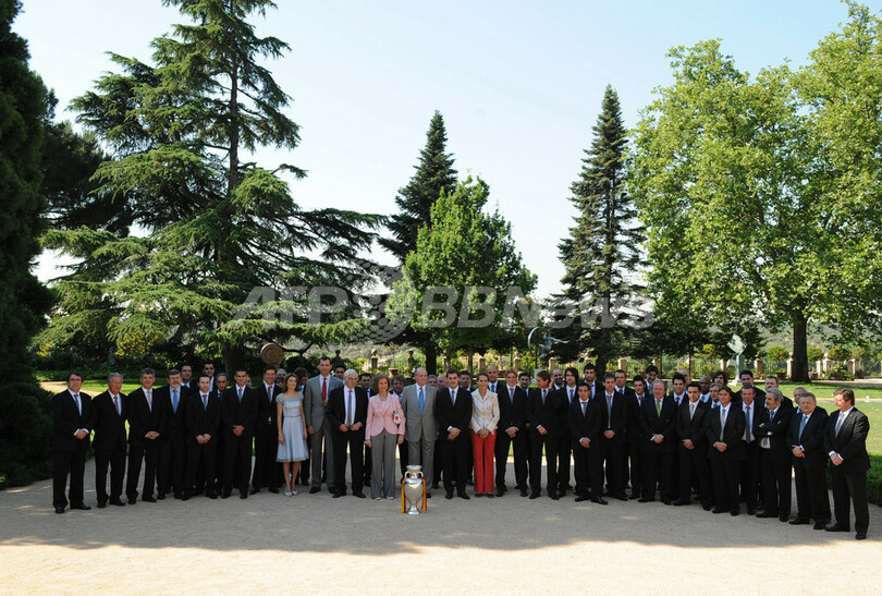 また、同代表は歓迎会の前にサルスエラ宮(Zarzuela Palace)を訪問し、国王フアン・カルロス1世(Juan Carlos)がパレードで着ていた赤いユニフォームとは異なり、黒いスーツにネクタイを締めた選手たちを歓迎した。フアン・カルロス1世は「胴上げするためのブランケットが無いんですよ」とルイス・アラゴネス(Luis Aragones)監督にジョークを飛ばし、フェリペ皇太子(Crown Prince Felipe)は、チームが勝ち取ったトロフィーにはまだシャンパンのにおいがすると語っていた。(c)AFP
