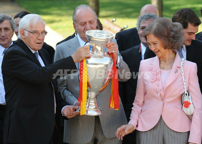 また、同代表は歓迎会の前にサルスエラ宮(Zarzuela Palace)を訪問し、国王フアン・カルロス1世(Juan Carlos)がパレードで着ていた赤いユニフォームとは異なり、黒いスーツにネクタイを締めた選手たちを歓迎した。フアン・カルロス1世は「胴上げするためのブランケットが無いんですよ」とルイス・アラゴネス(Luis Aragones)監督にジョークを飛ばし、フェリペ皇太子(Crown Prince Felipe)は、チームが勝ち取ったトロフィーにはまだシャンパンのにおいがすると語っていた。(c)AFP