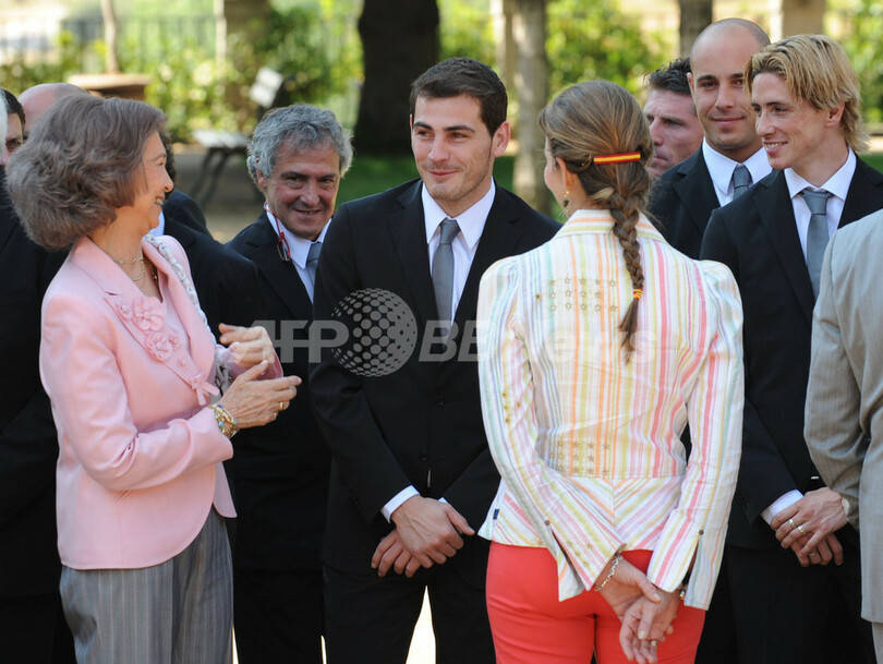 また、同代表は歓迎会の前にサルスエラ宮(Zarzuela Palace)を訪問し、国王フアン・カルロス1世(Juan Carlos)がパレードで着ていた赤いユニフォームとは異なり、黒いスーツにネクタイを締めた選手たちを歓迎した。フアン・カルロス1世は「胴上げするためのブランケットが無いんですよ」とルイス・アラゴネス(Luis Aragones)監督にジョークを飛ばし、フェリペ皇太子(Crown Prince Felipe)は、チームが勝ち取ったトロフィーにはまだシャンパンのにおいがすると語っていた。(c)AFP