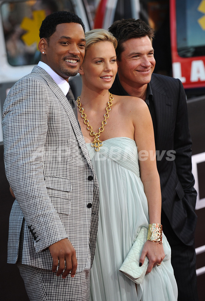ハリウッド(Hollywood)のグローマンズ・チャイニーズ・シアター(Grauman’s Chinese Theatre)で開催された映画『ハンコック(Hancock)』のワールドプレミア上映会に登場した出演者の(左から)俳優ウィル・スミス(Will Smith)、女優シャーリーズ・セロン(Charlize Theron)、俳優ジェイソン・ベイトマン(Jason Bateman、2008年6月20日撮影)。(c)AFP/Getty Images/Robyn Beck
