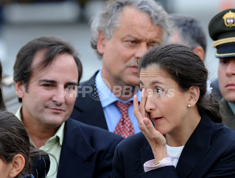 ベタンクールさんの家族は、ベルナール・クシュネル(Bernard Kouchner)仏外相に付き添われ、コロンビアの首都ボゴタ(Bogota)に到着した。着陸後、専用機のドアが開くとベタンクールさんはタラップの階段を上り、娘のメラニー・デロワ(Melanie Delloye)さんと息子のロレンゾ・デロワ(Lorenzo Delloye)さん、前夫のファブリス・デロワ(Fabrice Delloye)さん、姉のアストリッド・ベタンクール(Astrid Betancourt)さんと喜びをともにした。(c)AFP