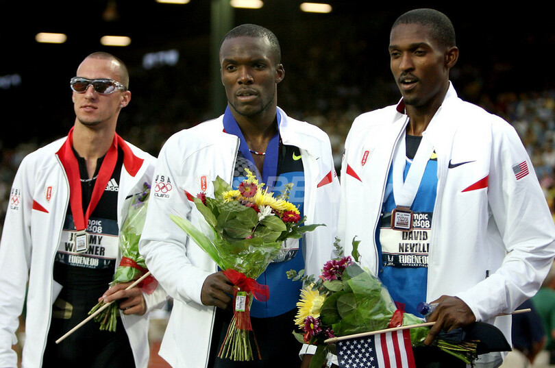 【7月4日 AFP】陸上、全米選手権(USA Outdoor Track & Field Championships)兼北京五輪米国代表選考会(US Olympic Team Trials - Track & Field)男子400メートル決勝。ラショーン・メリット(LaShawn Merritt)は、44秒00を記録して優勝を果たし、五輪出場権を手にした。また2位にはジェレミー・ウォーリナー(Jeremy Wariner)、3位にはデービッド・ネビル(David Neville)が入り、それぞれ代表入りを果たした。(c)AFP/Getty Images