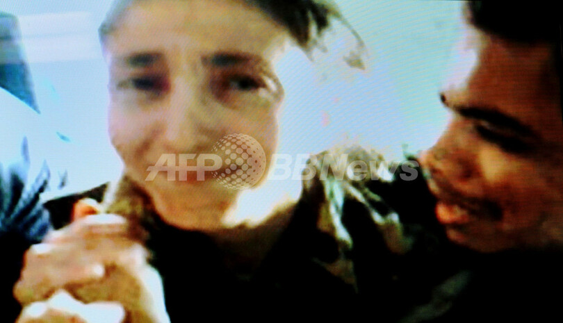 その後ビデオは、軍のヘリコプターの中で手錠が外され、解放されたことを知らされると涙を流して喜ぶ元人質たちの姿を映し出した。