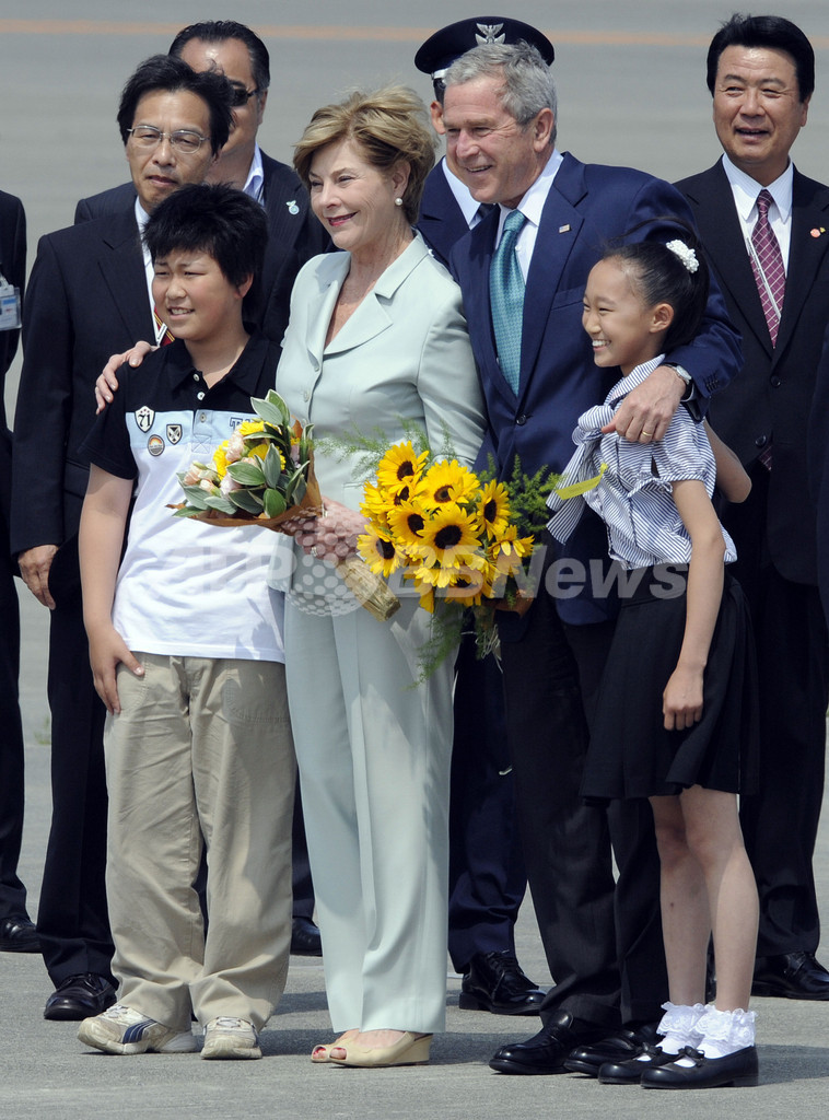 【7月6日 AFP】(写真追加)米国のジョージ・W・ブッシュ(George W. Bush)大統領は6日、7日に開幕する北海道洞爺湖サミット(G8 Hokkaido Toyako Summit)に出席するため日本に到着した。