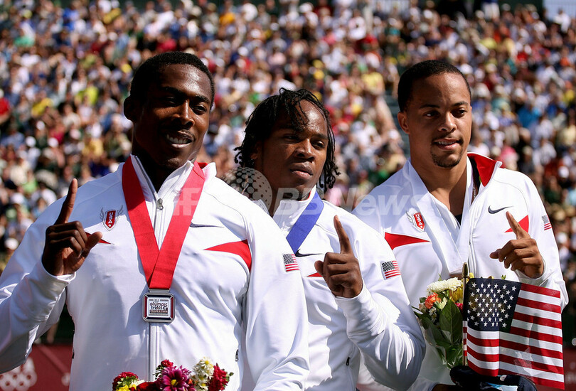 【7月7日 AFP】陸上、全米選手権(USA Outdoor Track & Field Championships)兼北京五輪米国代表選考会(US Olympic Team Trials - Track & Field)男子200メートル決勝。ウォルター・ディックス(Walter Dix)は、19秒86を記録して優勝を果たし、100メートルに続いて五輪代表入りを決めた。また2位にはショーン・クロフォード(Shawn Crawford)が、3位にはウォレス・スピアーモン(Wallace Spearmon)が入り、それぞれ代表入りを果たした。(c)AFP/Getty Images