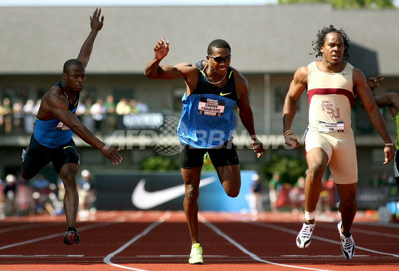 【7月7日 AFP】陸上、全米選手権(USA Outdoor Track & Field Championships)兼北京五輪米国代表選考会(US Olympic Team Trials - Track & Field)男子200メートル決勝。ウォルター・ディックス(Walter Dix)は、19秒86を記録して優勝を果たし、100メートルに続いて五輪代表入りを決めた。また2位にはショーン・クロフォード(Shawn Crawford)が、3位にはウォレス・スピアーモン(Wallace Spearmon)が入り、それぞれ代表入りを果たした。(c)AFP/Getty Images