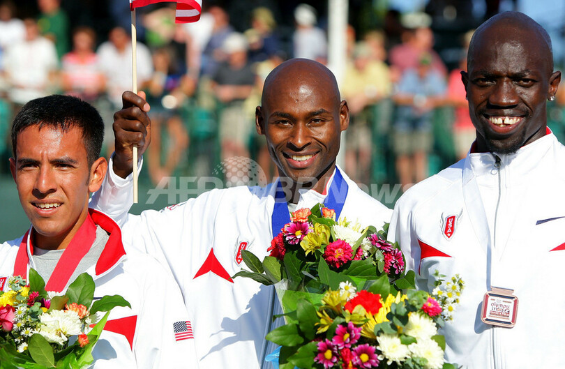 【7月7日 AFP】陸上、全米選手権(USA Outdoor Track & Field Championships)兼北京五輪米国代表選考会(US Olympic Team Trials - Track & Field)男子1500メートル決勝。バーナード・ラガト(Bernard Lagat)は3分40秒37を記録して優勝を果たし、2位のレオネル・マンザノ(Leonel Manzano)と3位のロペス・ロモング(Lopez Lomong)と共に五輪代表入りを決めた。(c)AFP/Getty Images