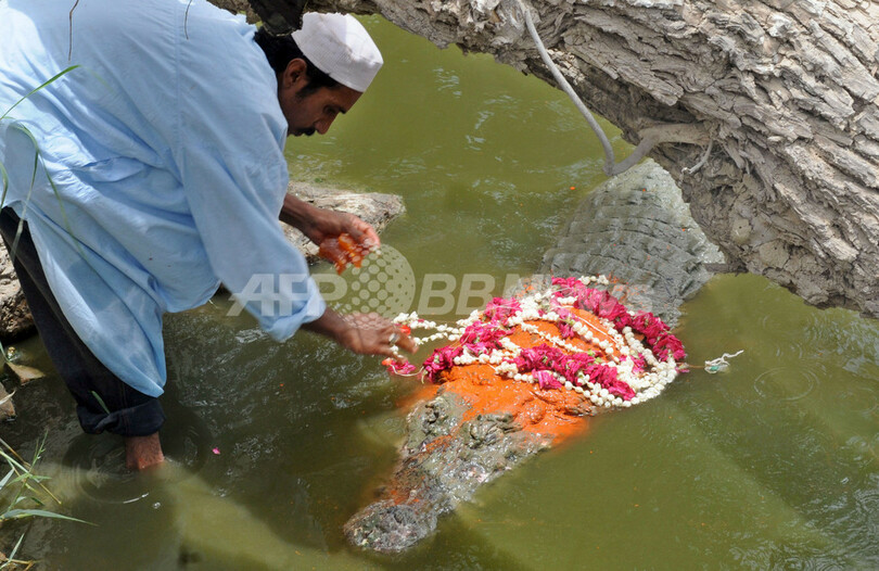 ニュース ライフ カラチのイスラム教祭典、神聖な生き物ワニもおめかし 2008年7月9日 11:22 発信地:カラチ/パキスタン [ アジア・オセアニア パキスタン ] このニュースをシェア ‹ › ❮ 1/5 ❯ パキスタンのカラチ(Karachi)郊外のManghopir寺院で開かれたイスラム神秘主義「スーフィー(Sufi)」の祭典で、ワニに染料を塗る信者(2008年7月6日撮影)。(c)AFP/Asif HASSAN 画像作成中 ! 【7月9日 AFP】パキスタンのカラチ(Karachi)郊外にあるManghopir寺院で6日、イスラム神秘主義「スーフィー(Sof)」の祭典が開かれ、信者らが池のワニの体に染料を塗るなどの伝統行事を行った。 地元には聖人(スーフィー)たちがこの地で救いを見出したという伝説を信じており、祭典では神聖な生き物とされるワニに餌を与え、太鼓をたたいて歌を歌うなどして祝う。(c)AFP ライフ 一覧へ> メディア・報道関係・法人の方向け 写真・動画 購入のお問合せ>