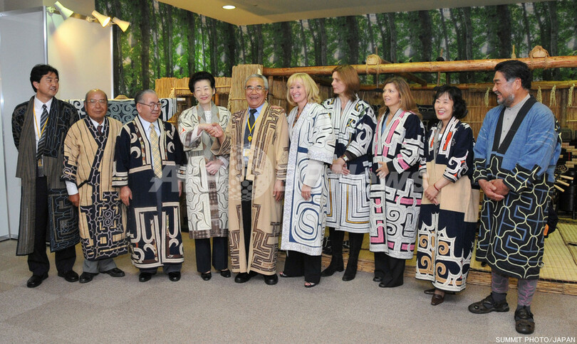 北海道留寿都村の国際メディアセンター(International Media Center)内の北海道情報館で、アイヌ民族衣装を身につけた福田貴代子(Kiyoko Fukuda)首相夫人(左から4人目)、ローリーン・ハーパー(Laureen Harper)カナダ首相夫人(右から5人目)、サラ・ブラウン(Sarah Brown)英首相夫人(右から4人目)、Margarida Sousa Uva欧州委員会(European Commission)委員長夫人(右から3人目、2008年7月8日撮影)。(c)AFP