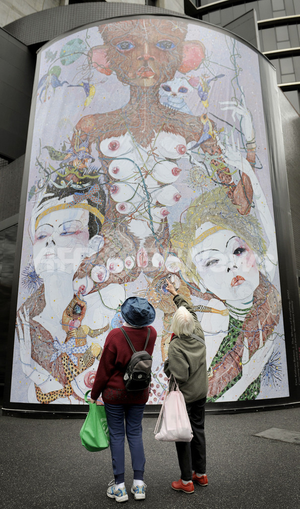これはオーストラリア人アーティストDel Kathryn Bartonさんの手による作品で、タイトルは「The Whole of Everything(なにもかもすべて)」。脚を広げた、多数の乳房を持つ女性が描かれているが、地元で「ポルノと芸術」についての議論を巻き起こしてはいないという。交差点に面したこのアパートの壁面は、現代アートの展示スペースを提供している。(c)AFP