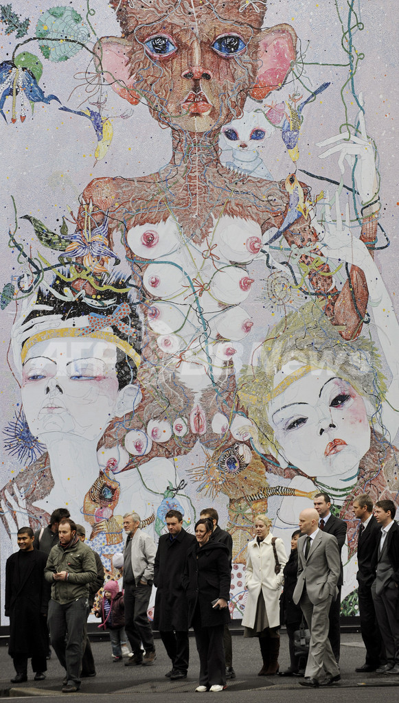 これはオーストラリア人アーティストDel Kathryn Bartonさんの手による作品で、タイトルは「The Whole of Everything(なにもかもすべて)」。脚を広げた、多数の乳房を持つ女性が描かれているが、地元で「ポルノと芸術」についての議論を巻き起こしてはいないという。交差点に面したこのアパートの壁面は、現代アートの展示スペースを提供している。(c)AFP